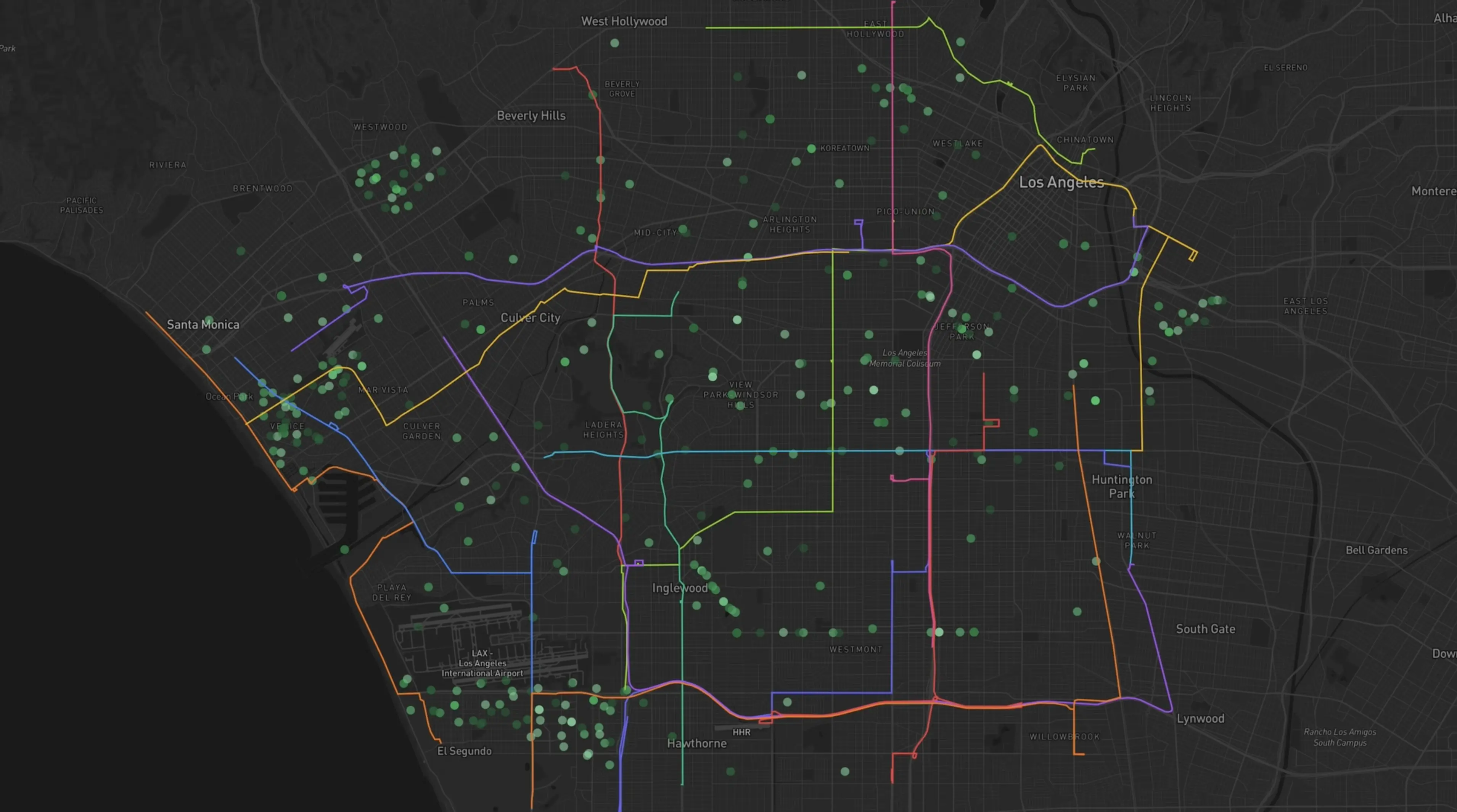 This method allowed us to help evolve transit as populations and environments evolved. We experimented by increasing population densities in areas; for example, a hypothetical series of new apartment complexes with 1,000 residents resulted in slightly adapted routes.